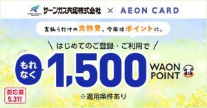期間中にご応募のうえ、弊社を含む対象企業いずれかの公共料金(電気・ガス・水道)のお支払いに、対象のイオンマークのカードのクレジット払いをはじめてご登録・ご利用いただくと、もれなく1,500WAON POINTを進呈!